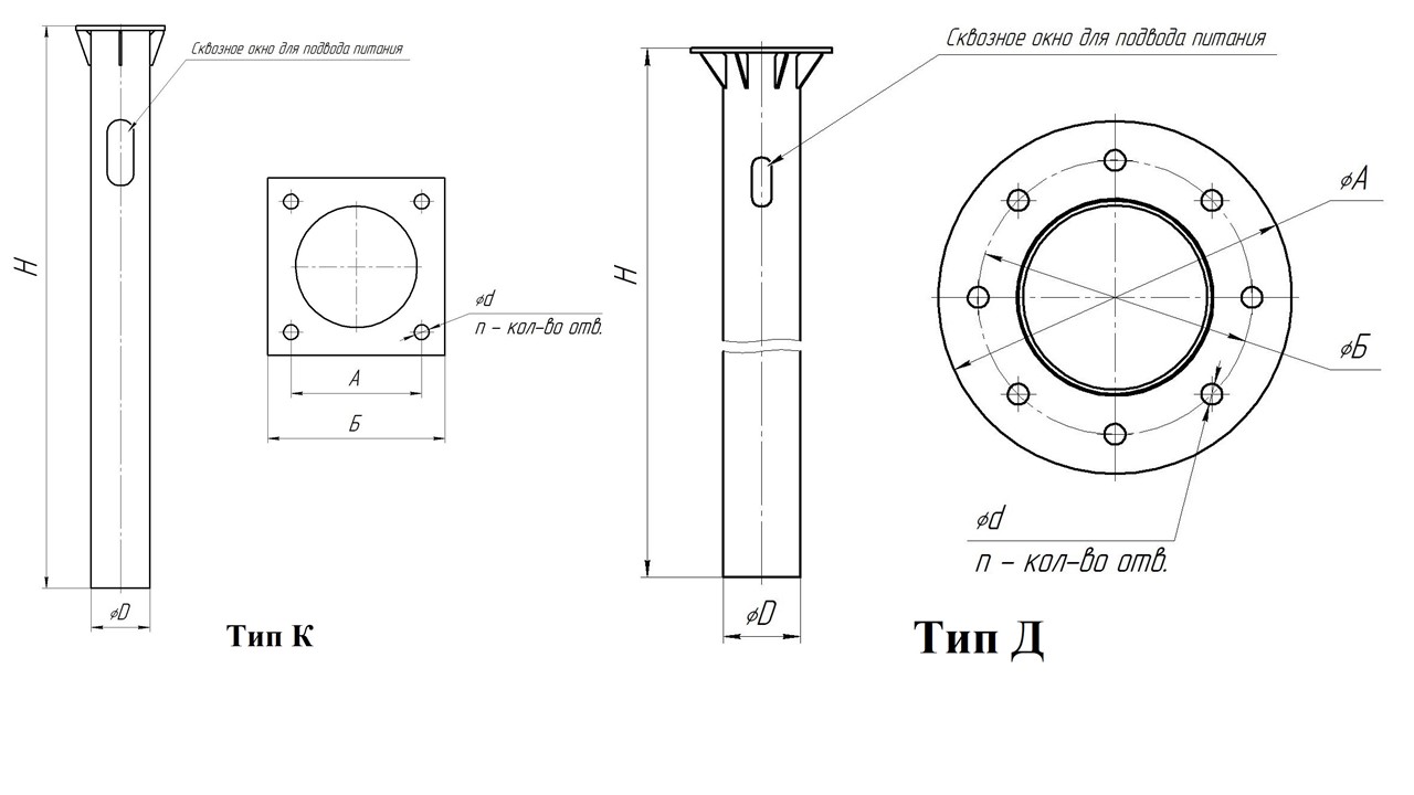 - Прямые: Представляют собой трубу с фланцем и подходят для стандартных установок опор освещения. Размеры и конфигурация фундамента выбираются исходя из особенностей грунта и планируемой нагрузки на опору.